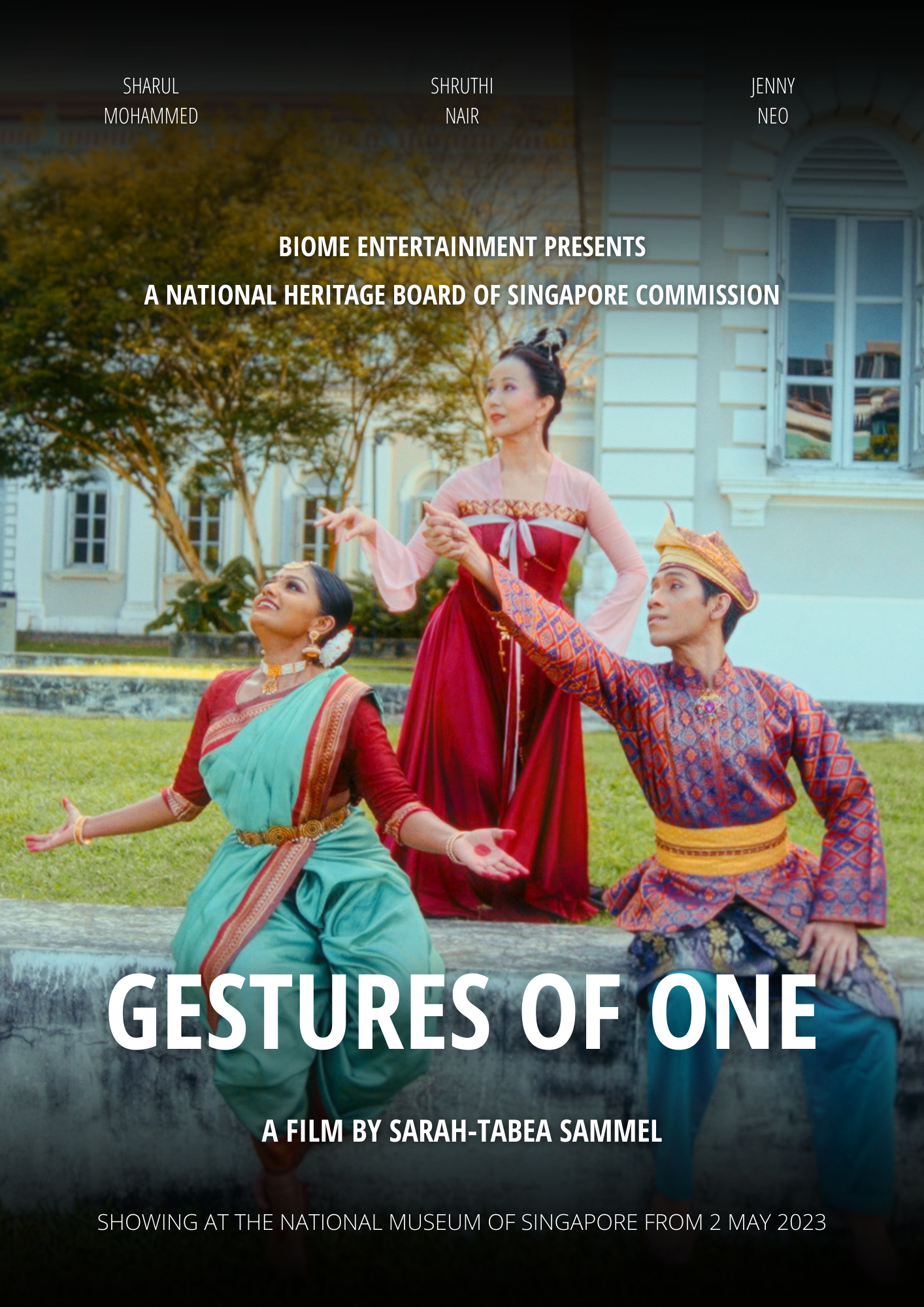 “Gestures of One”, a five-minute dance film artwork, explores Singaporean cultural heritage and its global outreach through cinematic language. In the short film, three dancers meet within the space of the National Museum of Singapore, referencing Chinese, Malay and Indian dance in both historical and modern nuances. The dancer’s movements are all different and rooted in their respective cultures and yet are shown to have similarities that allow the dancers to come together as an ensemble, with the museum as a fourth character in the film. The dancers’ gestures are an act of communication, dialogue and of interaction with one another and the space. Their story of an interconnected heritage seeks to welcome audiences into a dream-like experience of what unites us, with the intention to inspire harmony, solidarity and hope. The project has been awarded to Biome Entertainment Pte. Ltd. as Open Call winners as a commission by the National Heritage Board of Singapore.